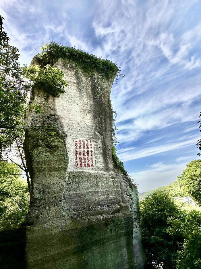 按照丁老师的指点,我们于中午时分到达寿宁禅寺。一位法师引导我们至大殿、祖师塔碑等处。然后出山门下山,带我们来到云石和棋盘石所在地。据《康熙会稽县志》记载,古吼山有八景,首景便为云石,呈现巍峨雄奇之态。云石西侧有一条长二十余米的石梁,横贯南北,犹如一只巨大的白象伫立池中。一柱孤岩自山顶悬空而下,直插水底,人称“象鼻吸水”。云石对面有三横石,便是棋盘石,相传两位仙人乘鹤于此,为景色所迷,故在石上对弈而得名。