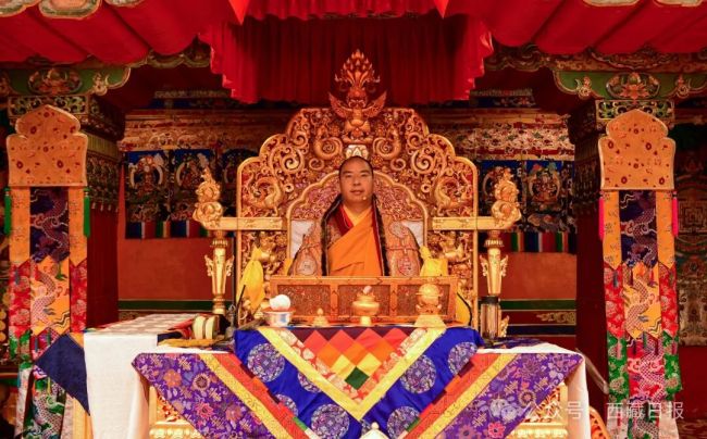 图为班禅在宝座上举行宗教仪轨。记者 索朗旺久 摄