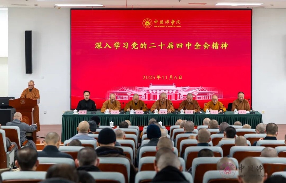 2025年11月6日,中国佛学院召开深入学习党的二十届四中全会精神暨“学法规、守戒律、重修为、树形象”教育活动动员会。常务副院长明海法师、副院长清远法师、理证法师出席会议。全体师生员工参加。