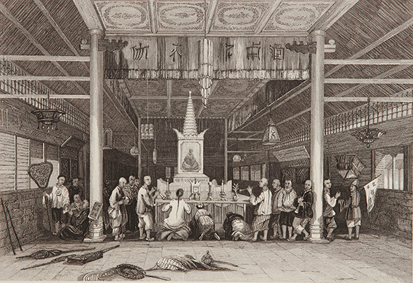 我曾多次参观这座著名的寺庙……在穿过成排紧密的船和餐饮场所,并通过一个狭窄的小门后,我惊讶地发现自己身处全然的寂静中!寺外如此喧嚣,而寺内却如此庄重宁静……我们走在一条宽阔平整、路边种满美丽树木的石板路上……我们到达了主殿,祭坛上供奉着三尊佛像,在殿墙两侧玻璃龛中摆放着其他一些小雕像,巨大的鼓和钟是寺庙的附属品,无疑是为了通知神灵,以便他们能够聆听向神灵祈祷的声音……我长时间地看着这件精美的雕塑作品,它的形状类似于我们的坟墓,顶部是两个小的长圆球,作品上面似乎串着大环,我对这座纪念碑的起源进行了许多猜测,它完全不符合中国艺术……我很容易相信它是从其他地方带来的。