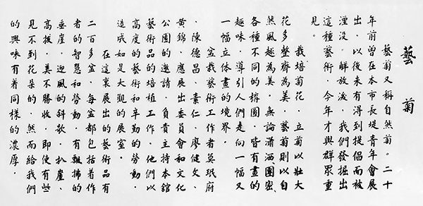 莫珉府书写的艺菊展简介,内容提及莫珉府和素仁等应展出展委员会和广州文化公园邀请,负责主持“艺菊观赏馆”艺术品的培植工作。(图片来源:广州海幢寺)