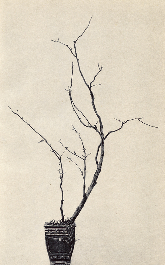 “素仁格”盆景与僧人绘画在艺术理念上可谓一脉相承,二者皆以简净的形式诠释禅宗哲思。八大山人画作中的孤鸟、残荷、空山等意象,通过极简笔墨构筑“无相”之境,展现禅宗顿悟的审美追求;而“素仁格”盆景则以瘦劲高飘的桩材、疏朗的矩形构图与大面积的留白,营造出空寂澄明的意境,生动诠释了禅宗“平常心是道”的修行理念。其代表作《姻缘》中斜刺的枝干既彰显孤傲之气韵,又与八大山人笔下那些夸张拉长的叶柄形成跨时空的呼应——前者矗立于虚空,后者孑立于水面,二者皆以“少即是多”的减法艺术,共同演绎着禅宗“真空妙有”的深邃哲学。