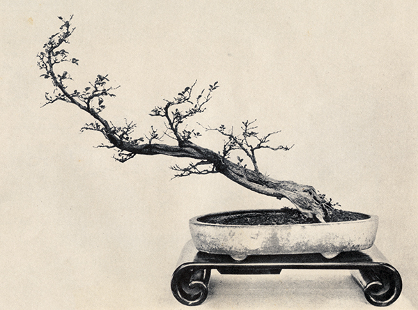 素仁当年莳养与创作的盆景今已无存,唯赖《广州盆景》存世的五帧盆景作品图像可窥其艺境精髓,分别为蜜梨素材作品《春初》、九里香素材作品《姻缘》、九里香素材作品《青苍》、红枫素材作品《向我话深秋》和九里香素材作品《欲偃》。虽仅存五帧,却各具风姿。细观之下,仍可窥见其共性特征——枝法洗练达至简之境,构图留白蕴空灵之美。