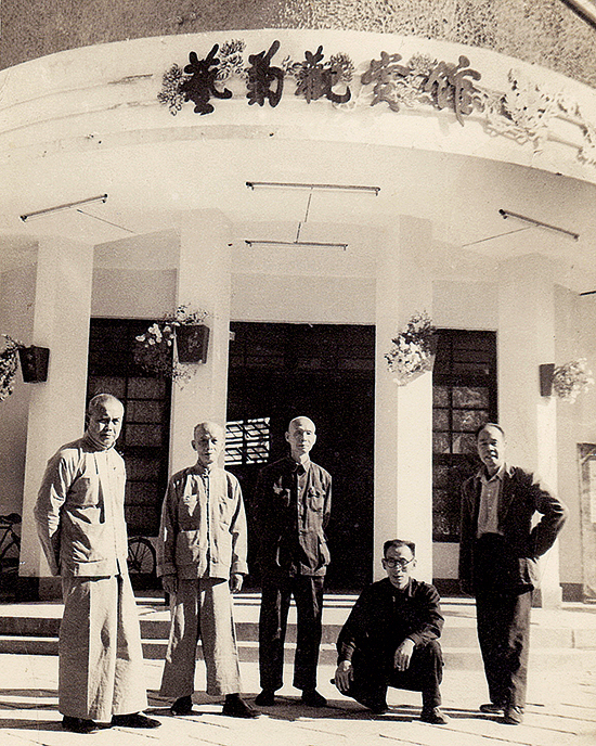 1957年素仁参加艺菊展,从左至右依次为:素仁、廖健文、黄锦、莫珉府(图片来源:广州海幢寺)