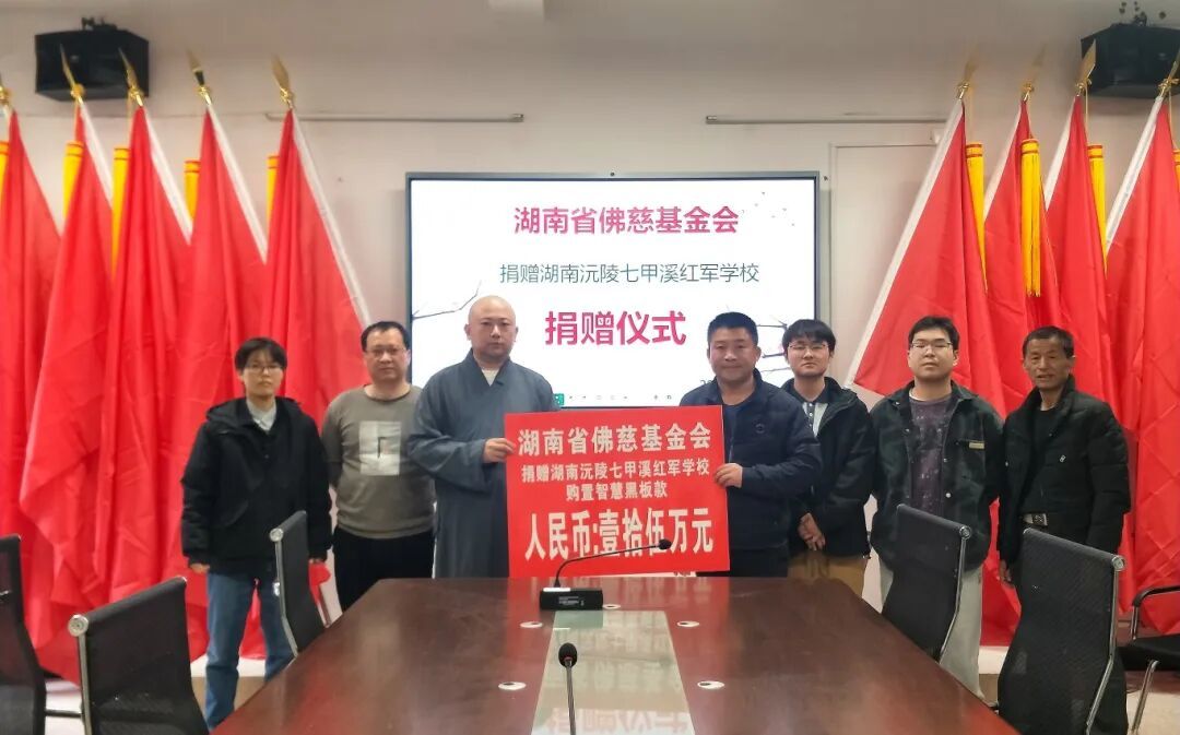 随后,双方在会议室举行简约的捐赠仪式。永兴大和尚代表湖南省佛慈基金会向七甲溪红军学校捐赠善款15万元,用于学校采购智慧黑板等教育教学设施。符辰海校长代表学校向永兴大和尚呈上爱心证书,表达全体师生对湖南省佛慈基金会的敬意和感谢。七甲溪红军学校副校长周丰淼及教师代表一同出席并见证了这一温暖时刻。