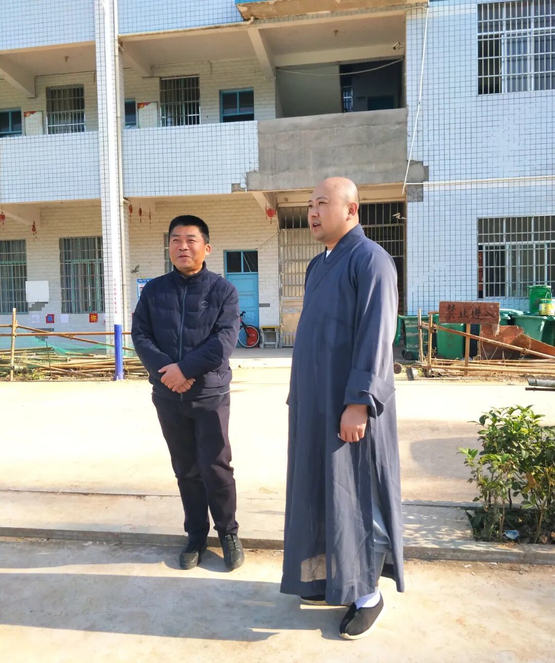 学校党支部书记、校长符辰海热情接待了永兴大和尚一行。符辰海校长向永兴大和尚简要介绍了学校的基本概况,目前共有师生170余名,除了主体教学楼,一些基础设施尚在建设当中。永兴大和尚实地走访该校新教学楼、运动场,了解基础设施建设进度及学校教育教学软件设施配备情况,详细询问学校在建设过程中存在的困难与问题。