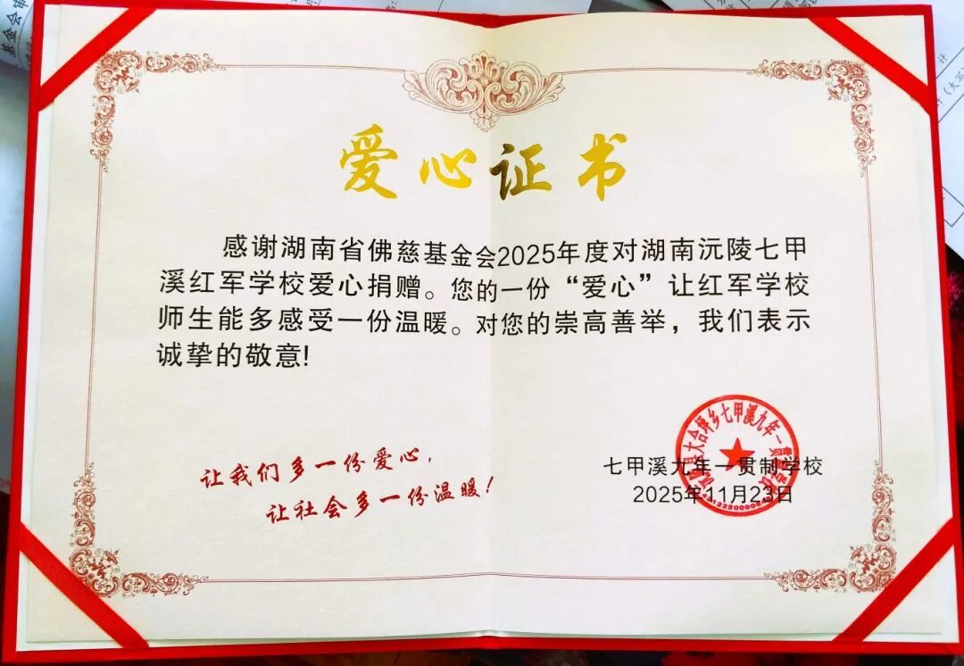 2025年11月25日,受湖南省佛慈基金会理事长能净大和尚的委托,基金会常务副理事长兼秘书长永兴大和尚及工作人员等一行四人,自溆浦县杨柳冲麻风村完成捐赠后,马不停蹄,驱车一路翻山越岭,于下午三点抵达七甲溪红军学校。