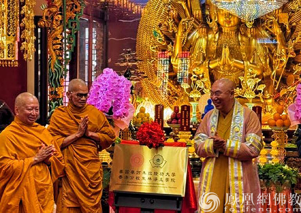 随后,宽运法师、梵智长老、帕拉布玛・潘迪长老,陈剑锽教授及东林护法居士代表共同为“泰国摩诃朱拉隆功大学香港分校东林净土学院”揭牌。此座法谊之桥,标志着净土法门弘化与僧才培育事业迈入新阶段,意义深远。现场大众同心祈愿东林净土学院如宝莲华,绽放香江,广育僧才、弘扬正法、利乐有情。