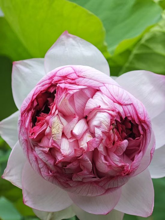但净因法师坚持了下来。2023年6月,荷花展成功举办,展出400多个品种、近4000盆荷花和睡莲。来自泰国的“万维莎”睡莲一朵花上同时呈现红黄两色,成为展览中的焦点。最神奇的是,当年竟开出了8朵极其稀有的天然并蒂莲,传为一时美谈。