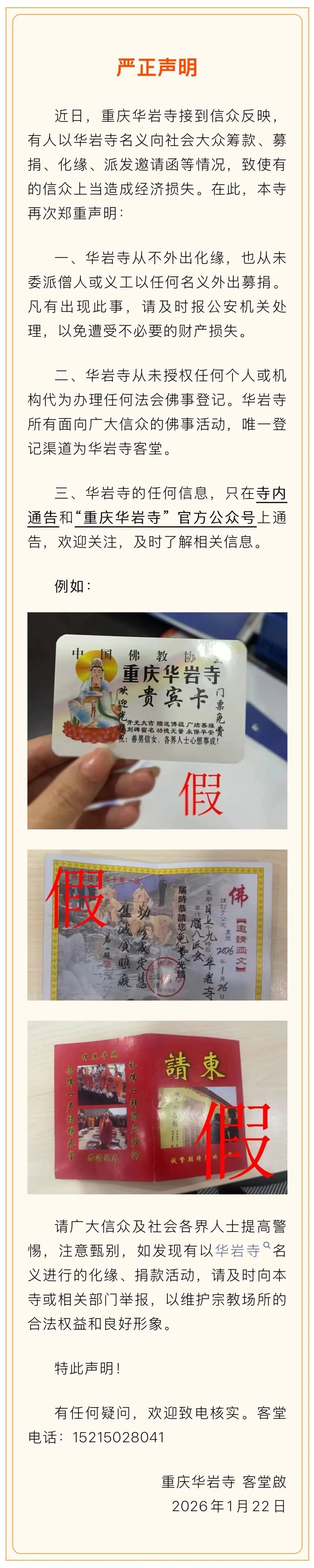 近日,有人以重庆华岩寺名义向社会大众筹款、募捐、化缘、派发邀请函等情况,致使有的信众上当造成经济损失。对此,华岩寺发布声明:从不外出化缘,也从未委派僧人或义工以任何名义外出募捐。声明全文如下:..