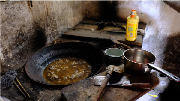 昏暗的屋内弥漫着发霉的味道,厨房的土灶上,生锈的锅盖下是早已发霉变质的汤。老屋角落里杂乱堆放着用过的油瓶、发霉的木柴和各类废品,这就是周爷爷每天生活的地方。