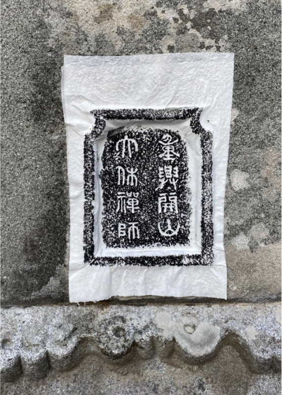 塔铭宽厘米,高厘米。大休墓平面呈“凤”字型,周边杂草丛生,墓丘正中为墓穴,块石垒砌,挡墙正中立一长方形青石板,石板中央刻有一方形小龛,上阴刻有“重兴开山大休禅师”等字样。青石挡板下方置有一青石横梁,刻有祥云、覆莲等图形。