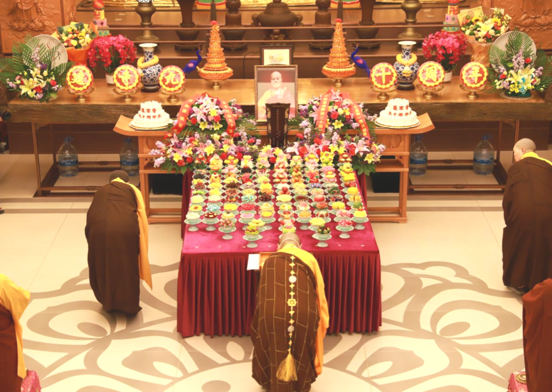 上午九时,追思传供活动在大雄宝殿举行。圣慧法师主法,依汉传佛教传统,108道供品由两序大众手手相传供养祖师。全程庄严肃穆,全体参与者摄心念佛,以虔诚之心表达对际然法师的感恩与追思。这场活动不仅是对祖师的深切缅怀,更是莲宗寺践行“学法规、守戒律、重修为、树形象”主题教育的生动体现——以庄严仪轨涵养道心,以如法行持树立寺院形象。