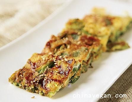 4、依次将所有菠菜沾上咖喱湿淀粉码在平底锅中,多余的咖喱湿淀粉可以倒入