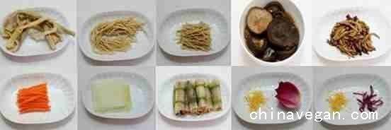 2、胡萝卜丝、扁尖笋丝、香菇丝加入少许盐、素易鲜、湿生粉拌匀,把3种丝用冬瓜片包住三丝卷起待用。两头用药芹扎住(药芹用开水烫软)。
