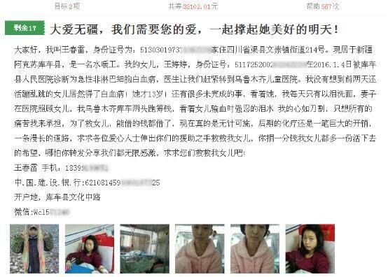 王婷婷生病时,在爱心筹上发的爱心募捐消息(截图):