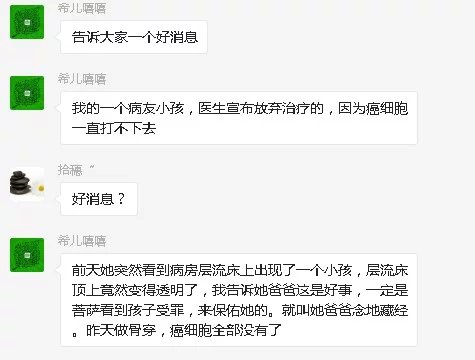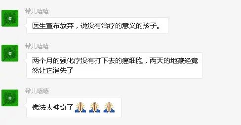 医生宣布之后,还没有办理出院,因为婷婷还在发烧。就在当天,也是2016年3月21号晚上,杨婷婷的爸爸打电话给卿晞妈妈,说孩子看到异象了,不知是怎么回事。卿晞的妈妈跟他说,这是你们诵经念佛后,佛菩萨来保佑婷婷了。她建议王婷婷爸爸加紧多念《地藏经》,念给孩子听。