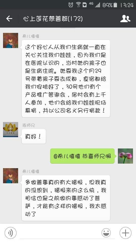 卿晞妈妈(即上面的希儿嘻嘻)听到这个消息,特别高兴,就在心上莲花慈善微信上分享出来了。陈师兄说,你分享这么正能量的好消息,让人对佛法生起强大的信心,这就是一件大善事,一定会有福报的!