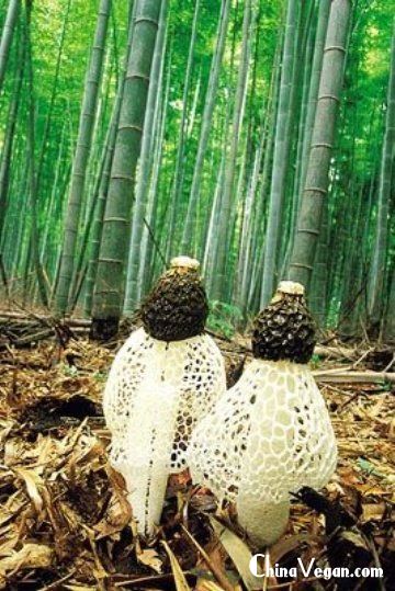 竹荪 是寄生在枯竹根部的一种隐花菌类,形状略似网状干白蛇皮,它有深绿色的菌帽,雪白色的圆柱状的菌柄,粉红色的蛋形菌托,在菌柄顶端有一围细致洁白的网状裙从菌盖向下铺开,被人们称为雪裙仙子、山珍之花、真菌之花、菌中皇后。竹荪营养丰富,香味浓郁,滋味鲜美,自古就列为草八珍之一。