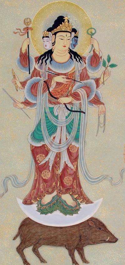 摩利支天菩萨像在五台山菩萨顶的大文殊殿。大殿正中供奉着主尊金身文殊菩萨,一旁供奉着三面摩利支天菩萨金身像。当我跪拜至摩利支天菩萨像时,内心生起无比欢喜,只觉夙愿得偿,心中的疑惑顿时得以开解。