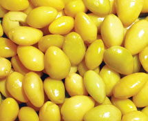 种子核果状,卵形或椭圆形,长1.5~3cm,宽1~1.8cm;表面乳白色至淡棕黄色,光滑,基部有1~2个圆点状突起,边缘有棱线。内种皮坚硬,种仁扁球形,淡黄绿色。味微甘、苦。