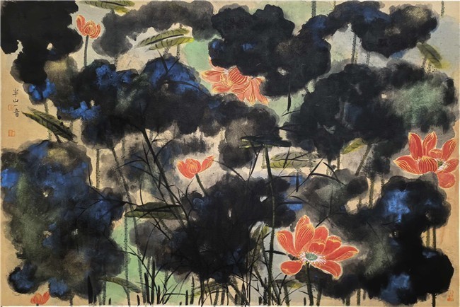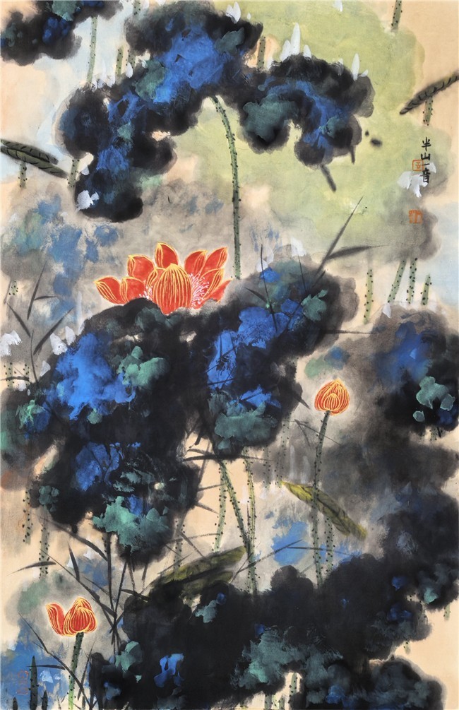 相较于他广为人知的清水指墨,《清净莲华图》在艺术语言的构思上展现出了截然不同的特质:以层层叠染的矿物颜料营造出一种深邃的空间尺度与物质上的不可替代感。精细勾勒的轮廓在绢底之下若隐若现,矿物颜料的层层叠加沉淀出久远的岁月感,令整个画面超越二维的物理局限,抵达一种近乎定境的心理纵深。